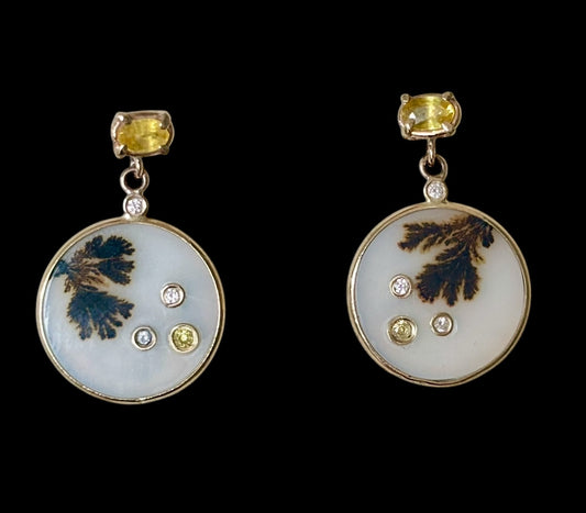 Dendritic Agate Earrings, with Yellow Sapphires and Diamonds