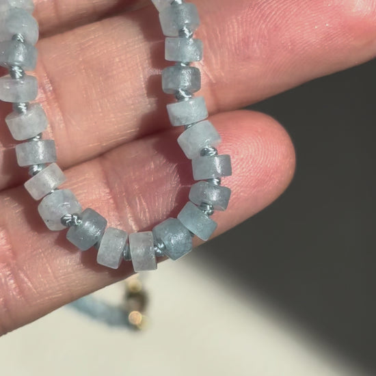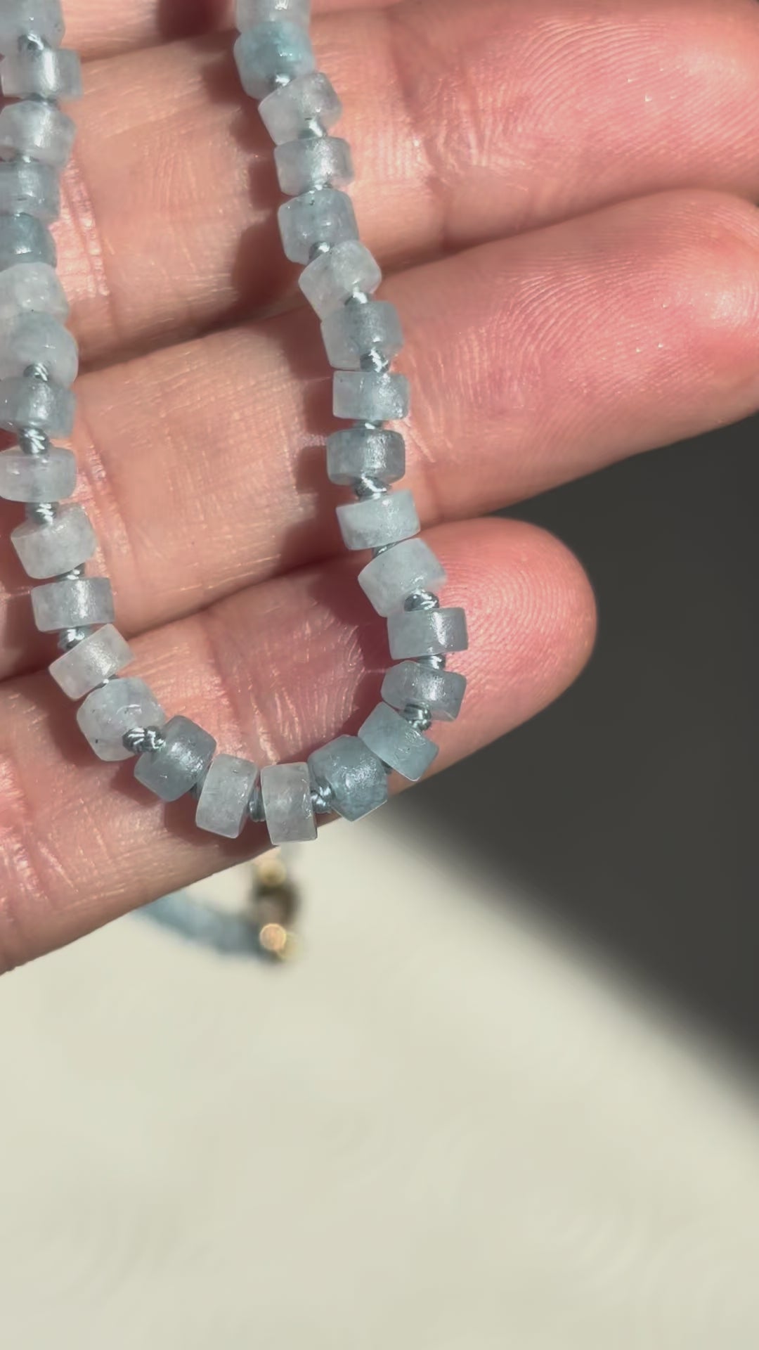 15.25” of 5mm Heishi aquamarine beads. This necklace is hand knotted with matching blue string that gives it a seamless look. It has a 14k gold lobster clasp.