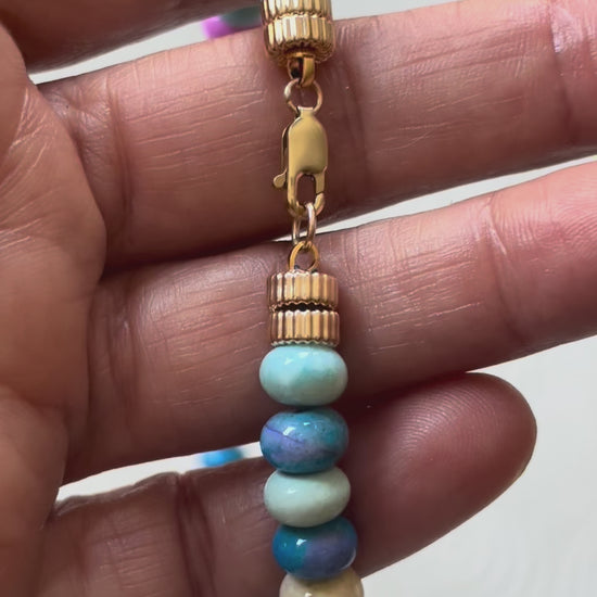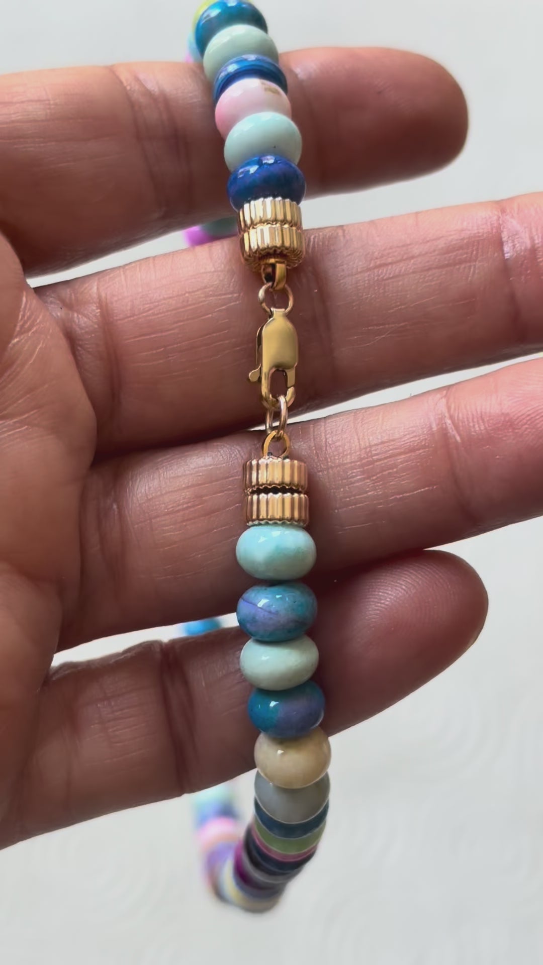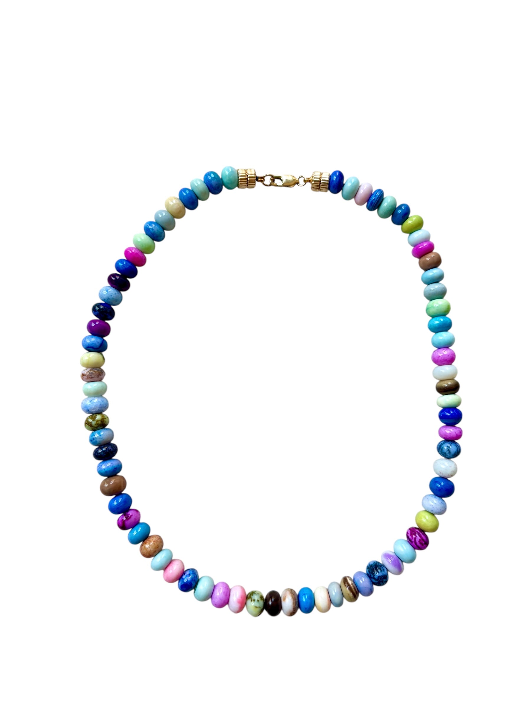 16” of multi-colored opal 8mm rondelle beads. The lobster clasp is abutted by four 14k gold beads.