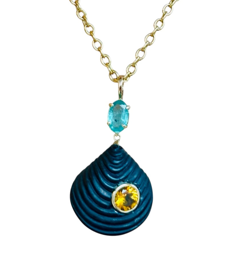 Carved Shell, Matte Black Onyx with Citrine & Emerald