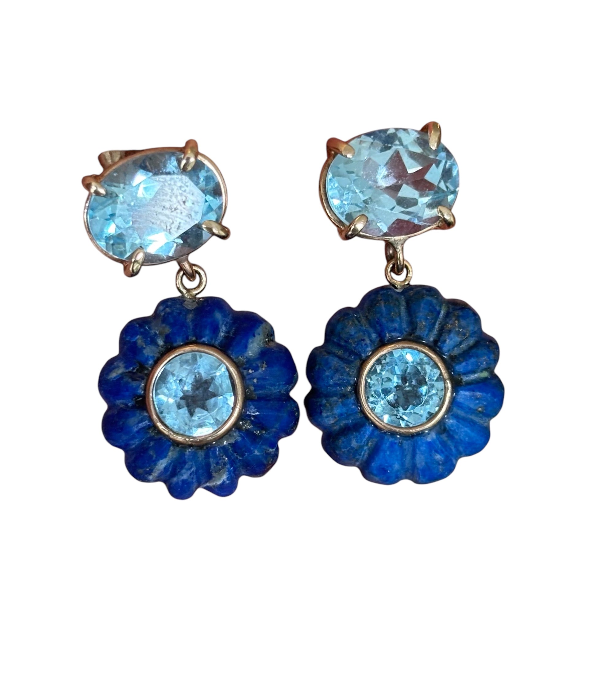 The carved lapis melon flowers (15mm in diameter) have stunning 7mm round blue topaz centers that are bezeled in 14k Gold. Equally stunning are the oval 10x7mm blue topaz’ at the top.