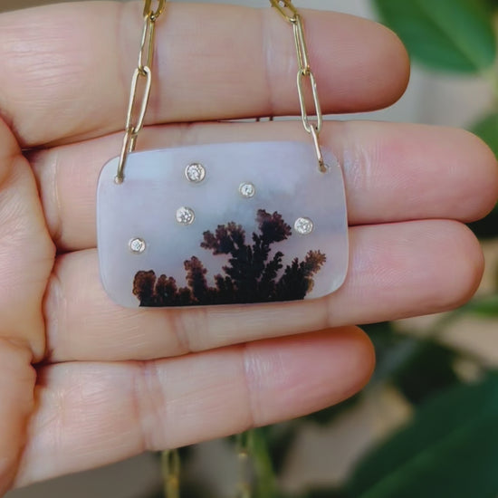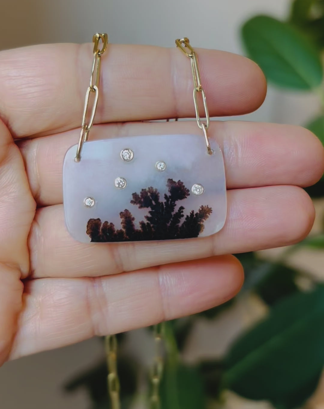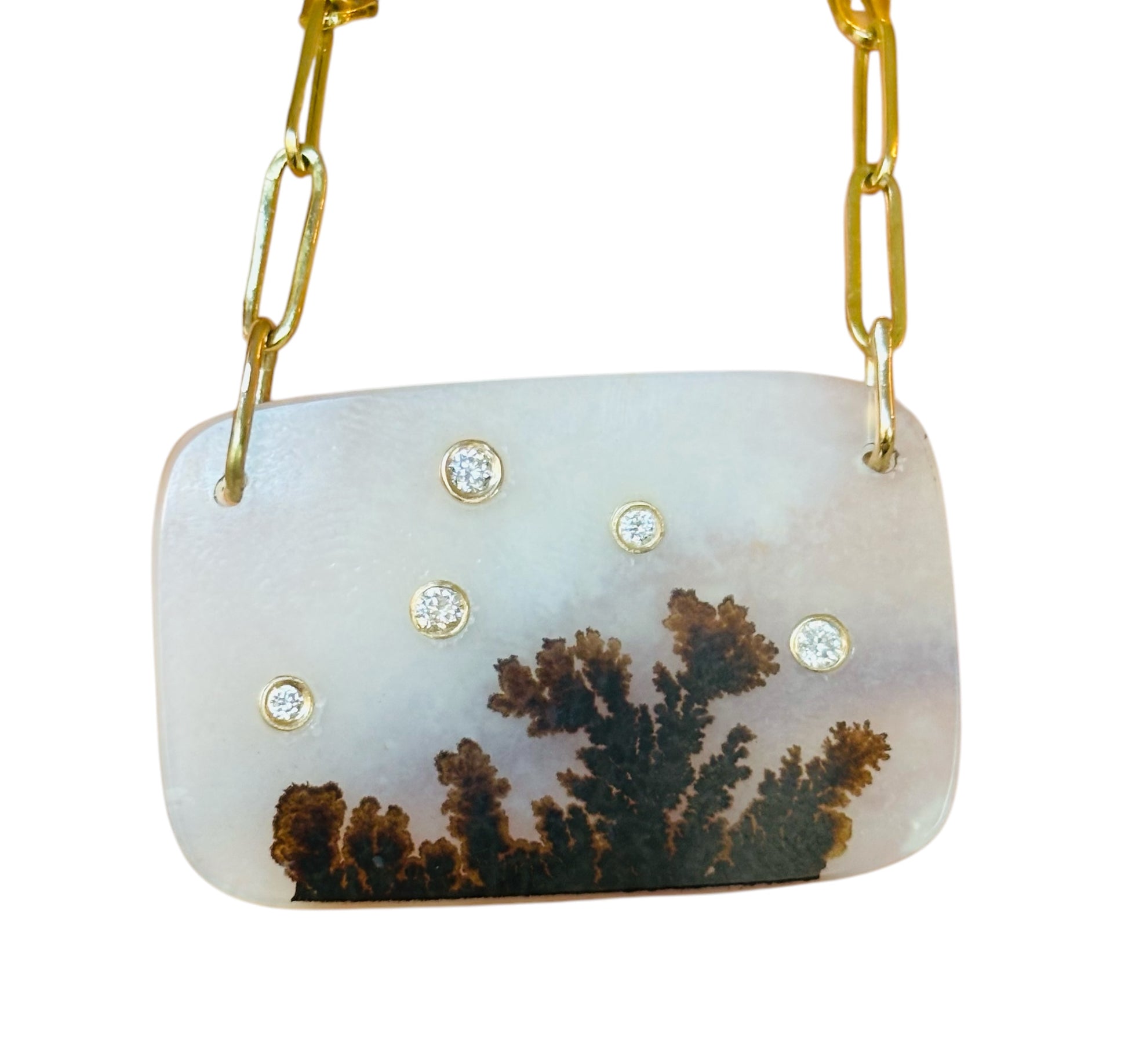 This a a one-of-a-kind necklace. The Dendritic Agate measures 35x23mm and has five 2mm round diamonds bezeled in 14k gold.
