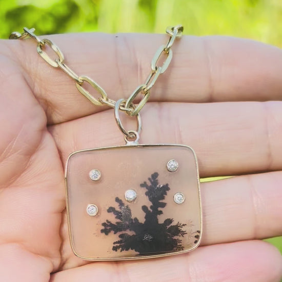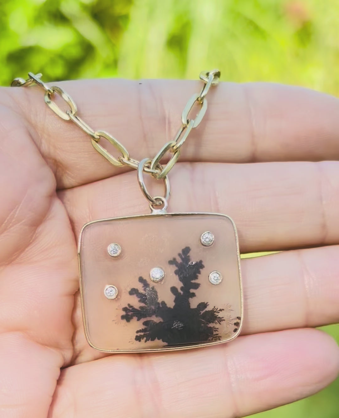 This lovely dendritic pendant is bezeled in 14k gold and is about 1.25” in width and 1” in length. The five 2mm round diamonds are also gold bezeled and create a beautiful natural scene.