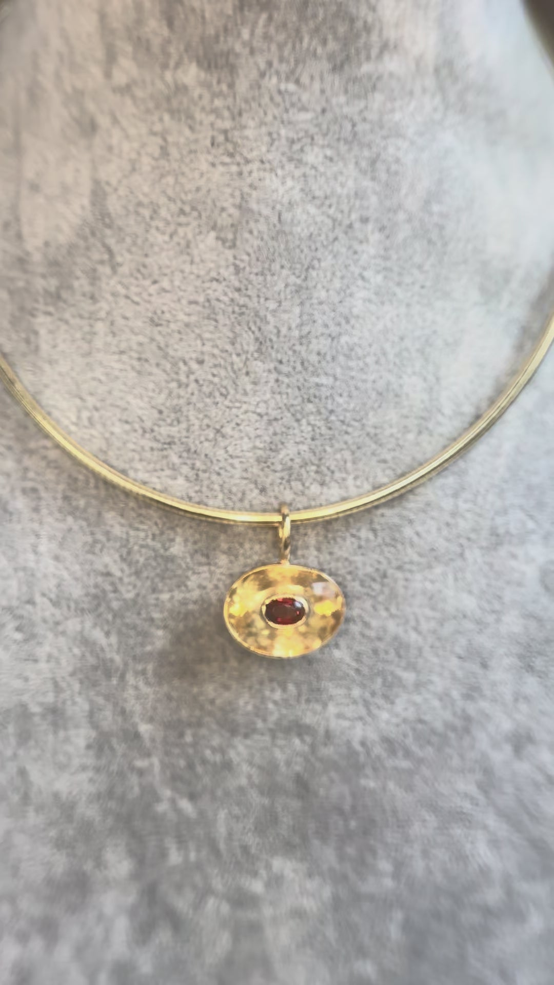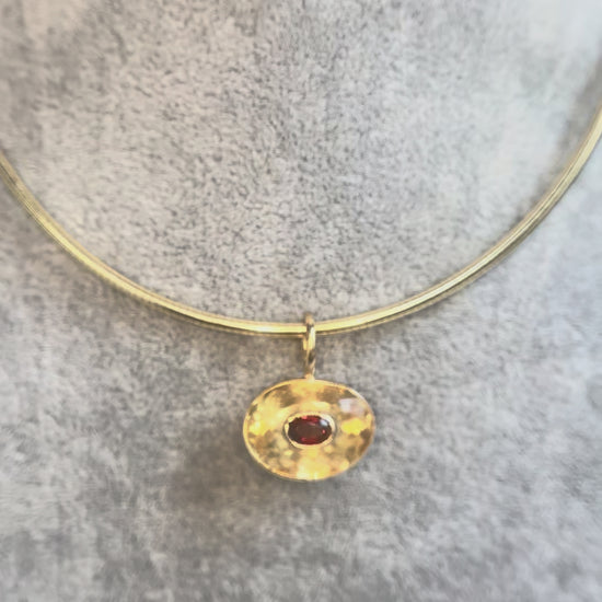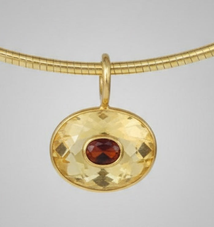 22x21mm oval citrine pendant bezeled in 14k gold with a center oval madeira citrine bezeled in 14k gold.