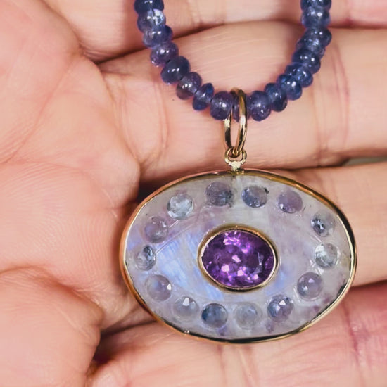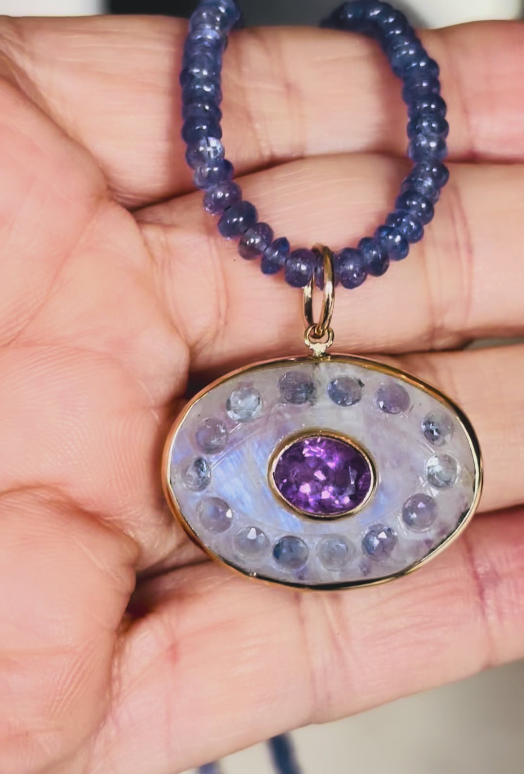 hand carved moonstone evil eye (1” x 3/4”, excluding ring bail) with center 8x6 oval amethyst bezeled in 14k gold and surrounded by fourteen 3mm round tanzanites.