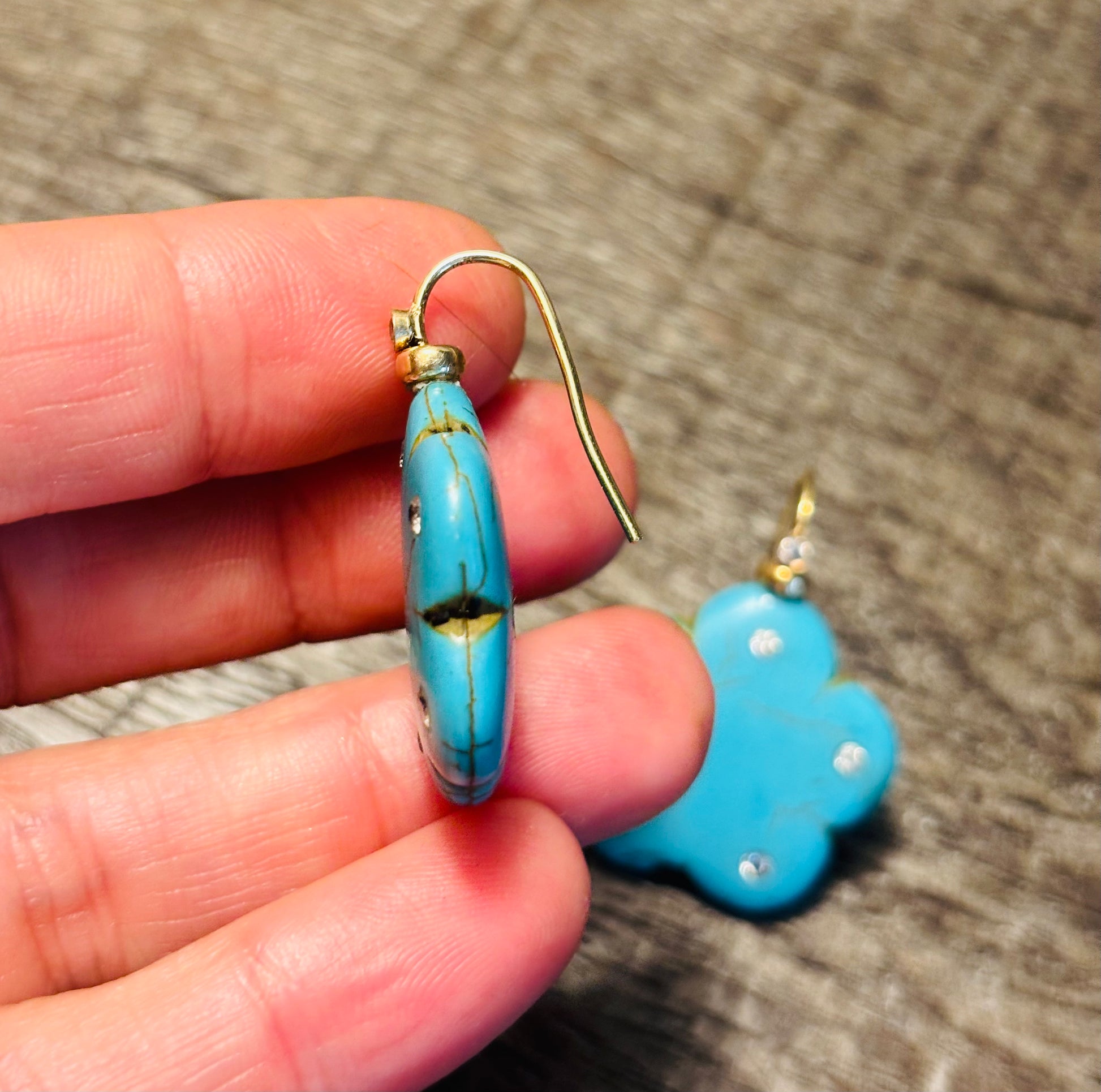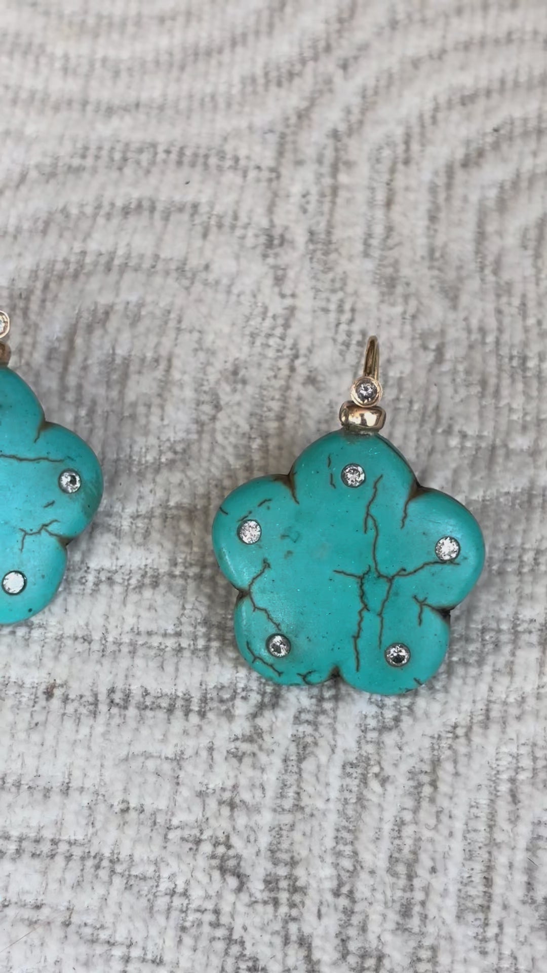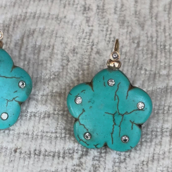 Carved turquoise flowers (1” diameter) with five 2mm round diamonds, one in each flower petal. And a 2mm gold bezeled diamond above the flower at the nape of the 14k gold hooks.