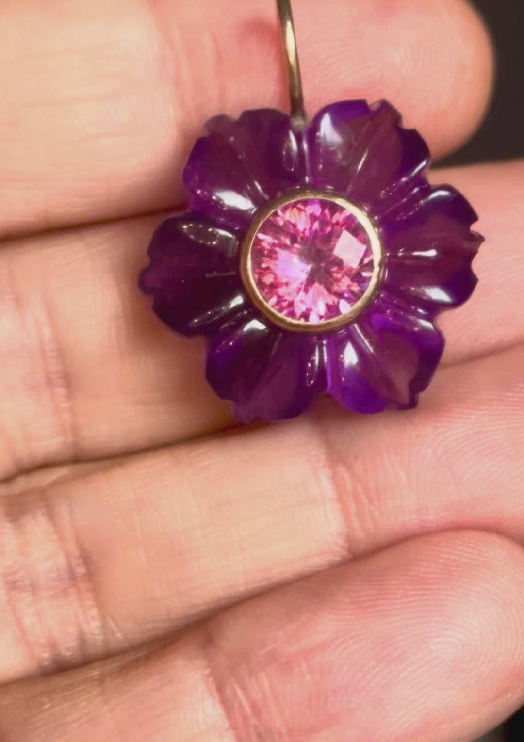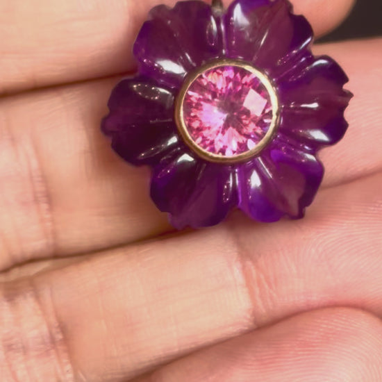 Carved amethyst flower, 19mm diameter, with center 8mm round pink topaz bezeled in 14k gold.