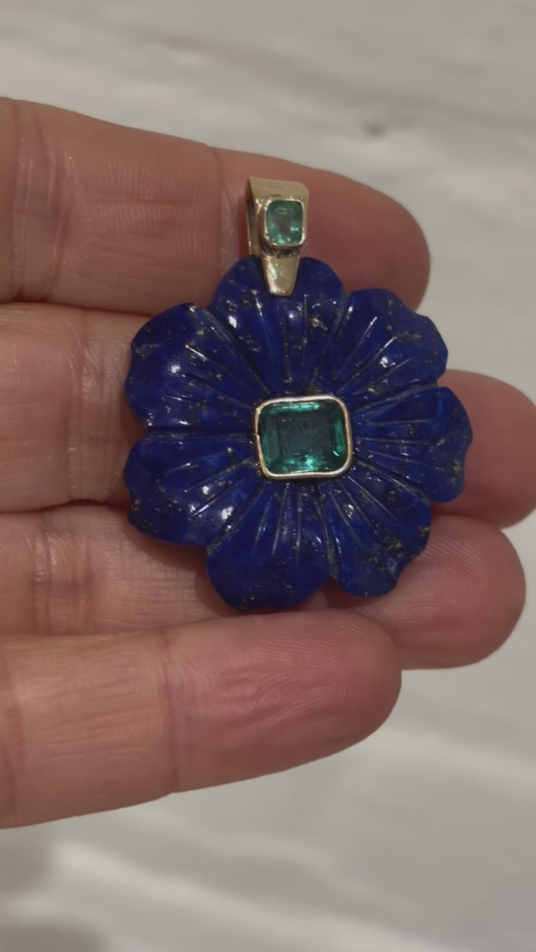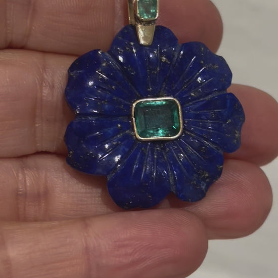A stunning carved lapis lazuli flower (35mm diameter) with center 8x6mm emerald bezeled in 14k gold.