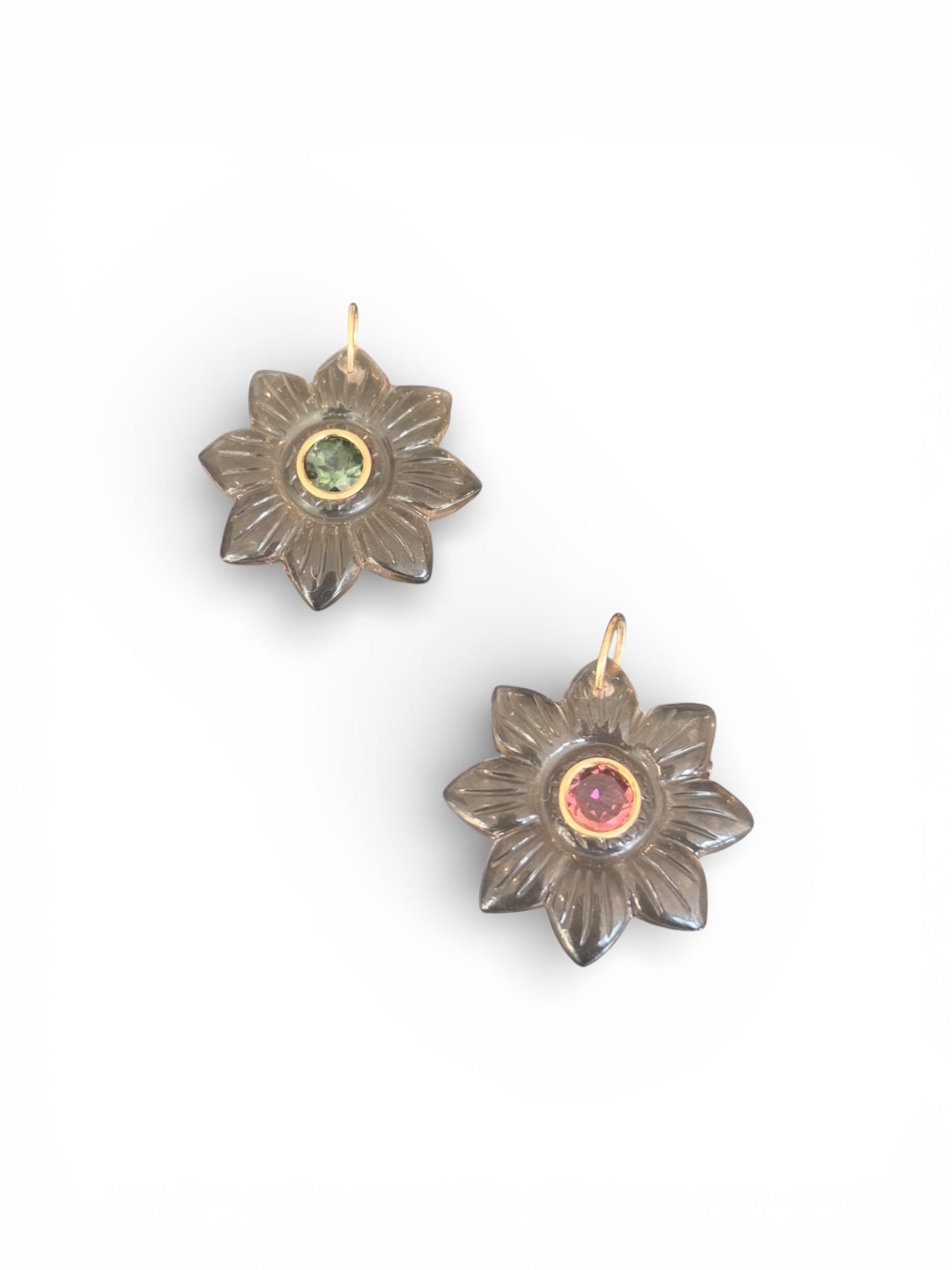 Carved smoky quartz flower, 1.25” diameter, with a center 6mm round green tourmaline bezeled in gold.