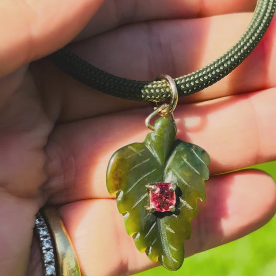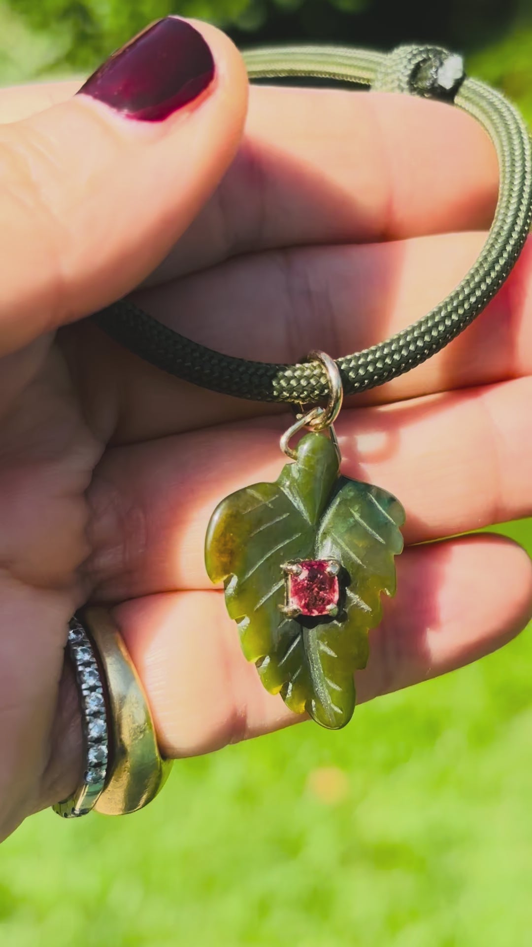 Carved leaf of natural Indian Agate pendant with the most stunning orange/pink spinel all with 14k gold.