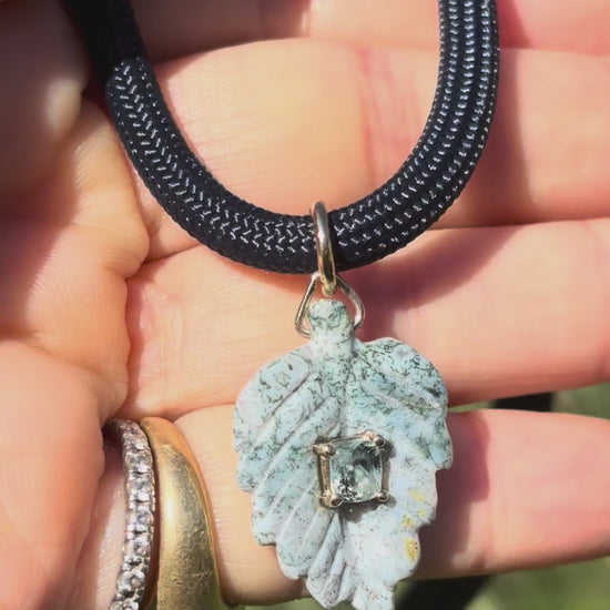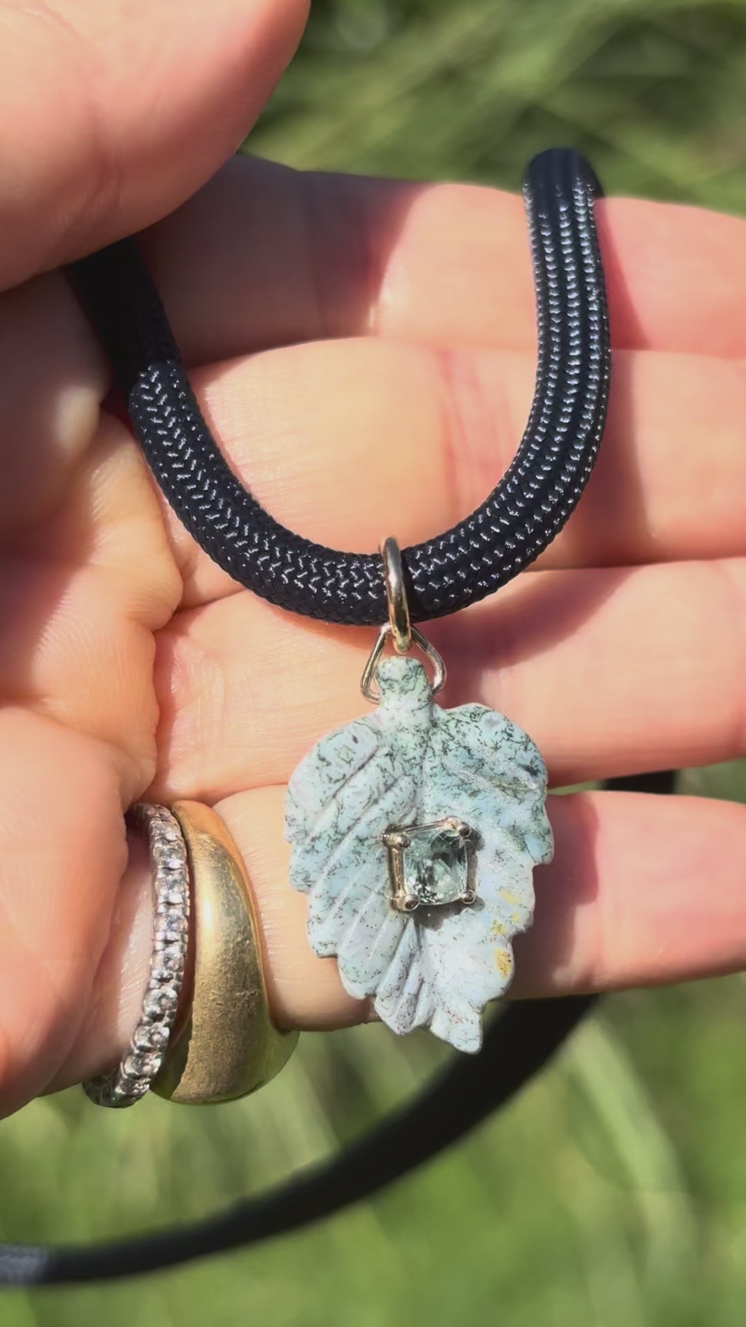 Carved leaf of natural Indian Agate pendant with the most stunning grey/blue spinel all with 14k gold.