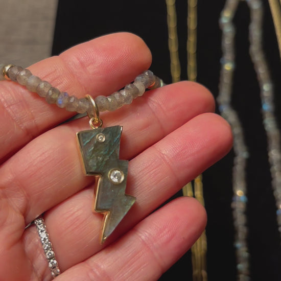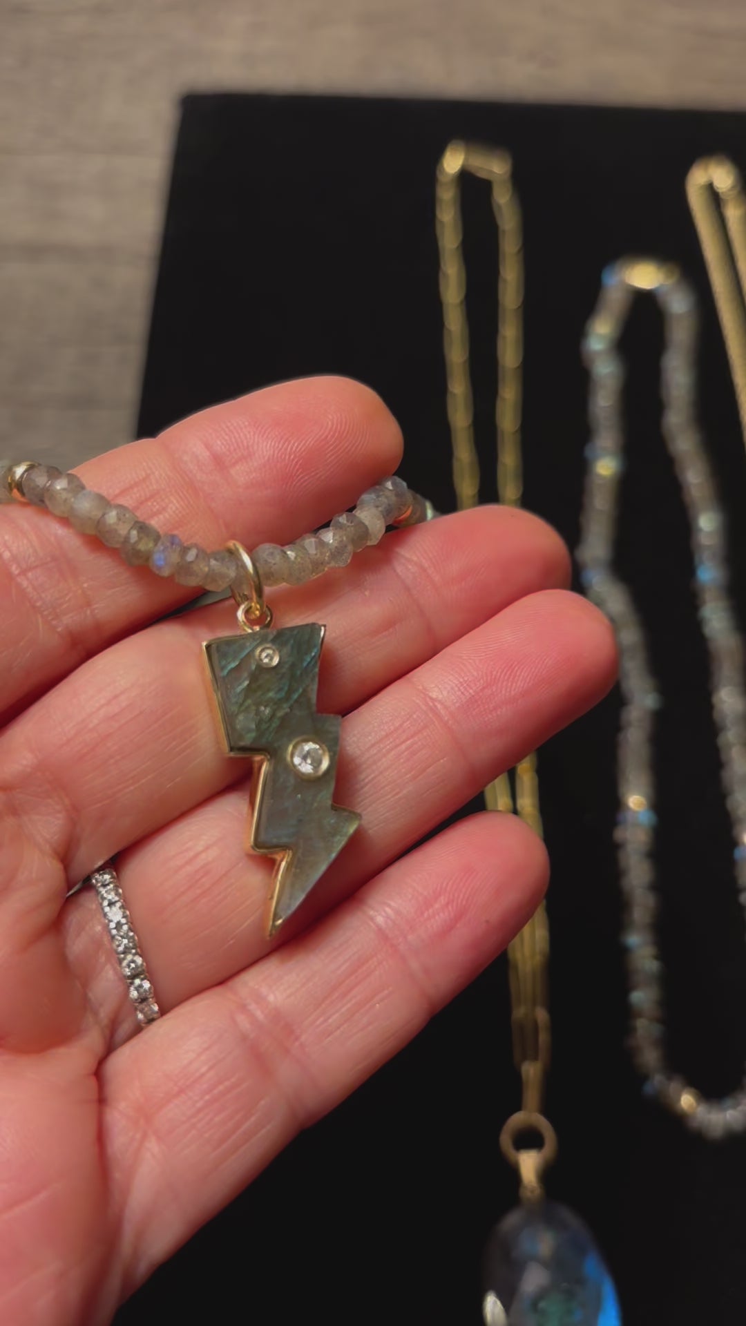 This is a one-of-a-kind carved labradorite lightning bolt with center 2mm round diamond bezeled in 14k gold and top 1mm round diamond bezeled in 14k gold