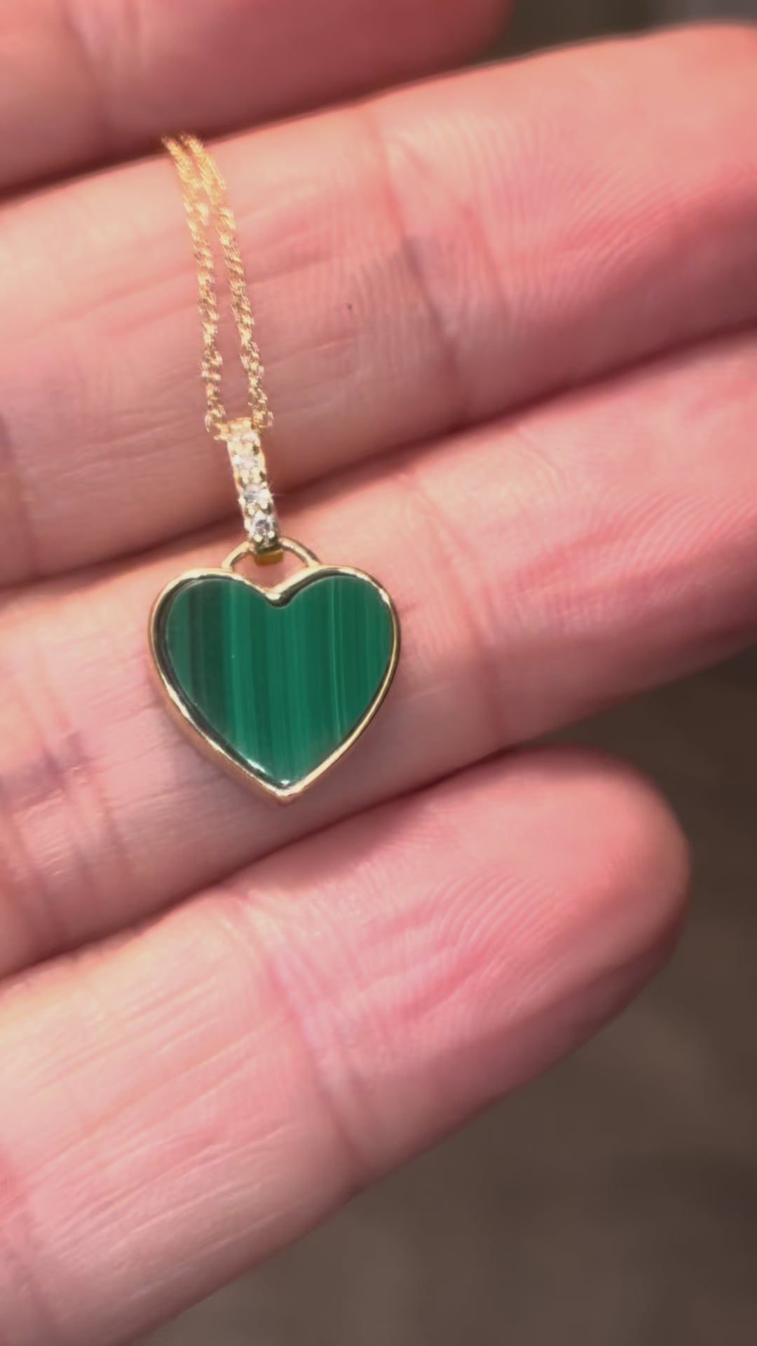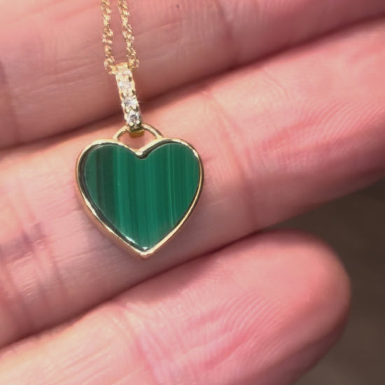 This is the sweetest necklace. 10mm malachite heart bezeled in thick 14k gold with a diamond bail and a delicate 18” 14k gold chain.