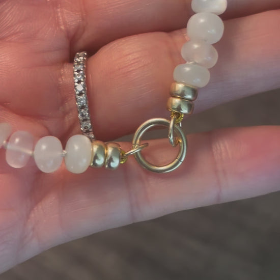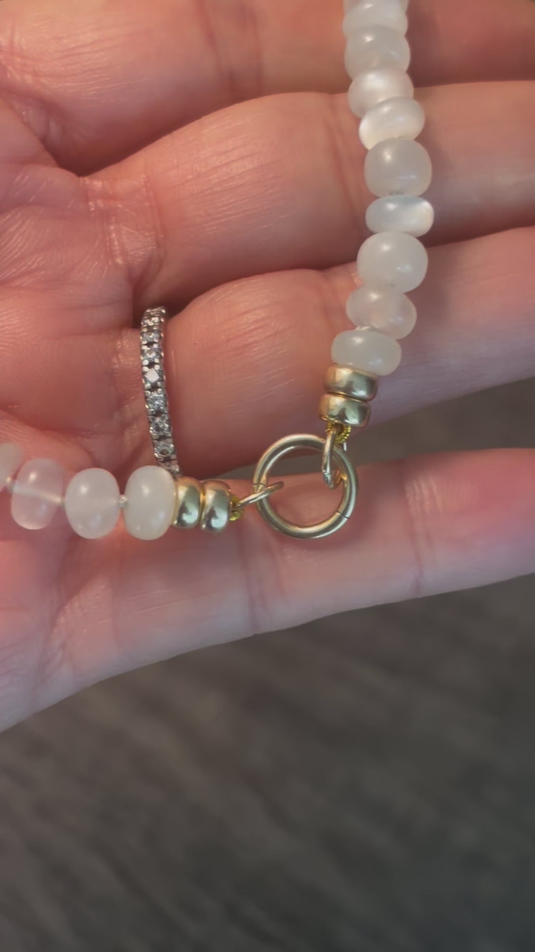 18.25” of 5mm moonstone beads with four 14k gold beads and a 10mm 14k gold charm enhancer (clicks open and close) that is attached.
