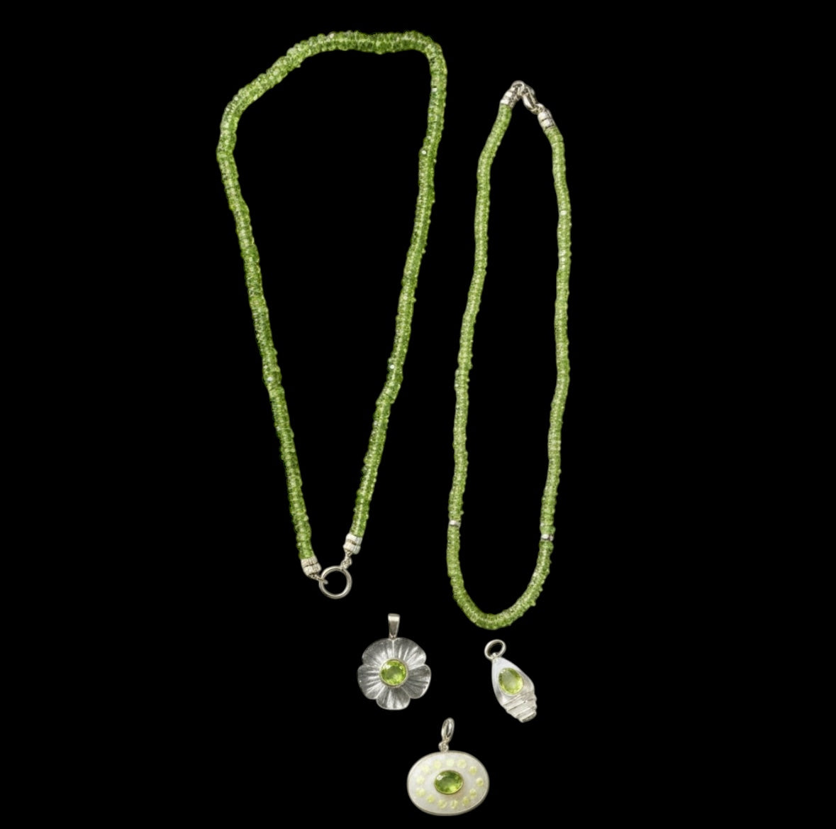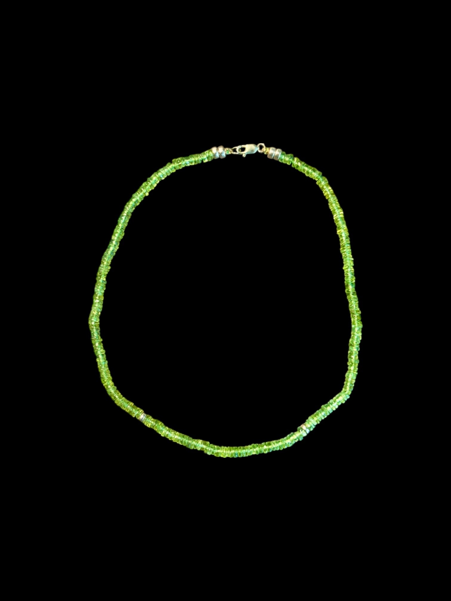 15.5” of beautiful 5mm rondelle peridot beads with six gold rondelle beads, two in front and four flanking the gold lobster clasp.