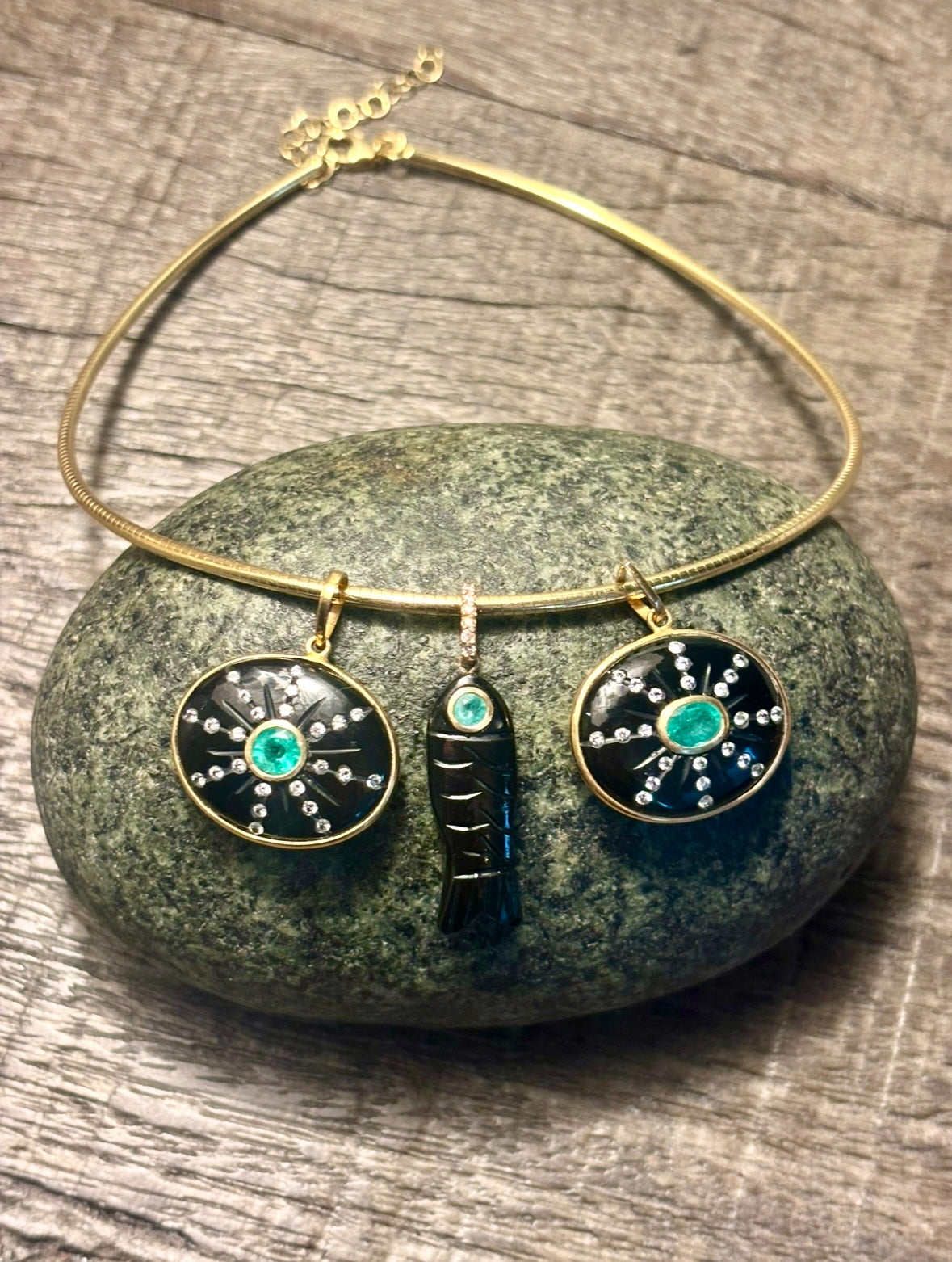 Poisson Pendant: Black Onyx with Emerald and Diamonds