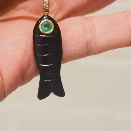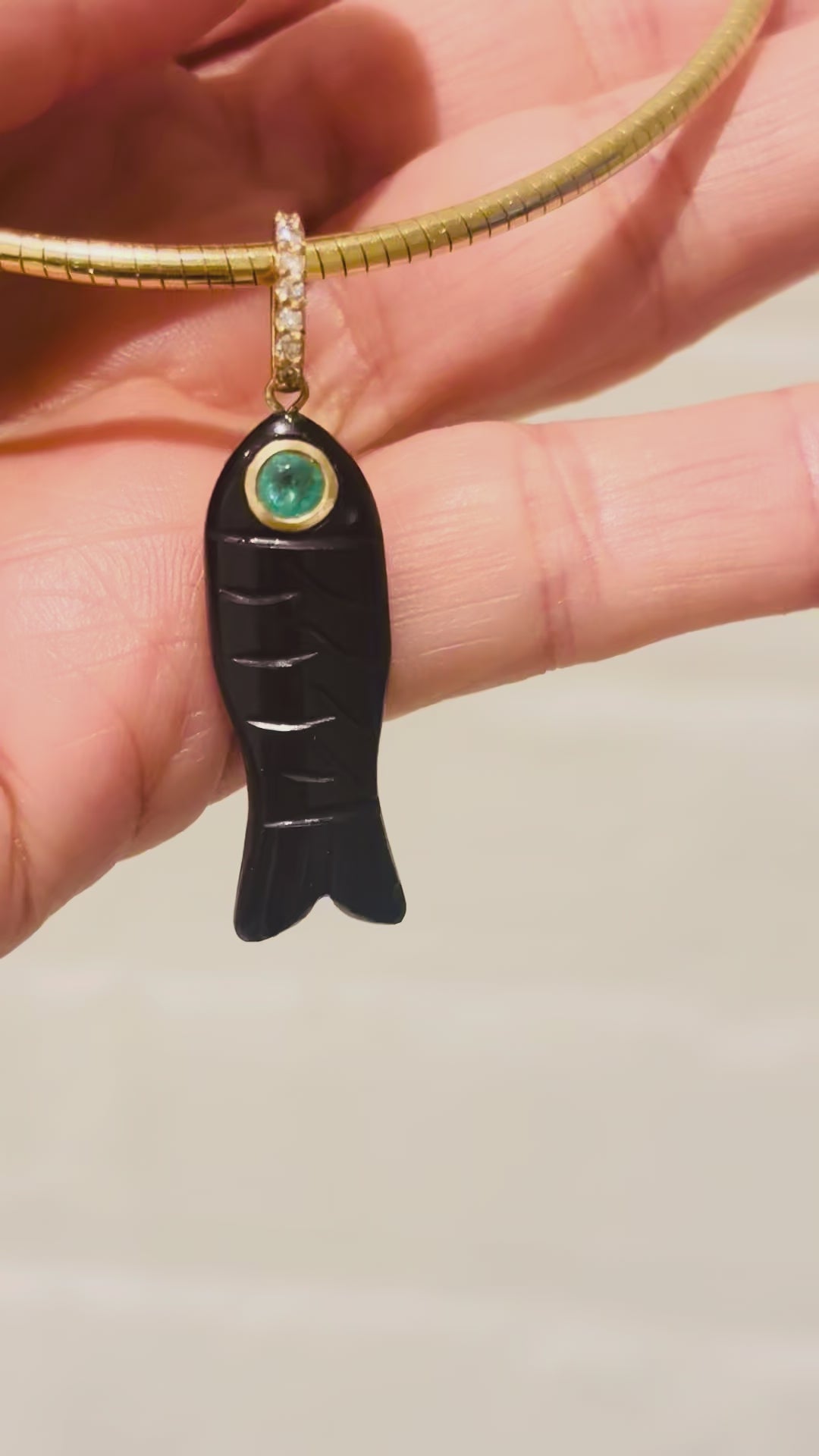 Carved Black Onyx Fish, 1.5” in length excluding the diamond bail, with a 4mm round emerald eye bezeled in gold.