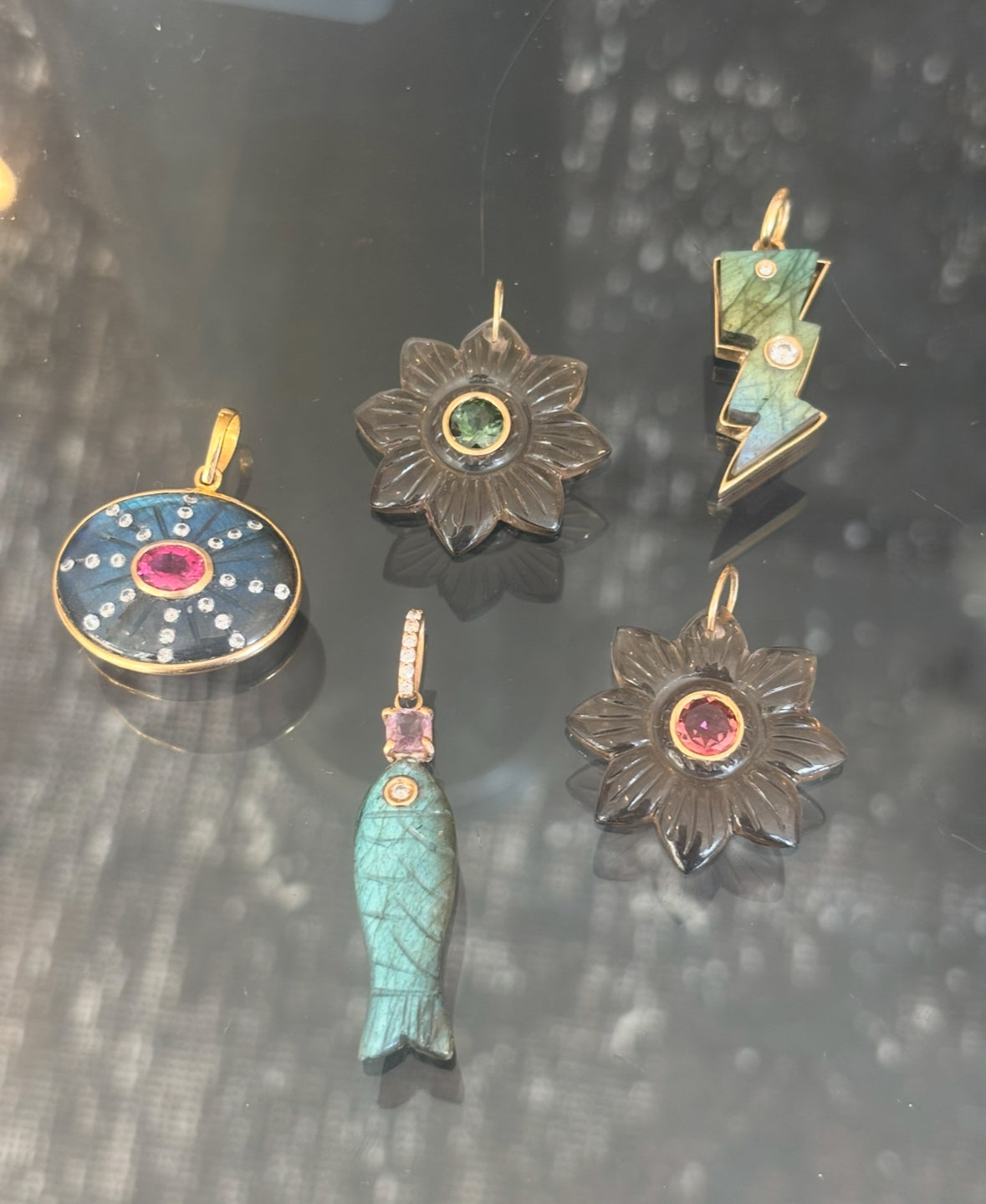 The flash of the labradorite reminds us to keep it magical. Paired with the diamonds and pink spinel just adds to its magic.