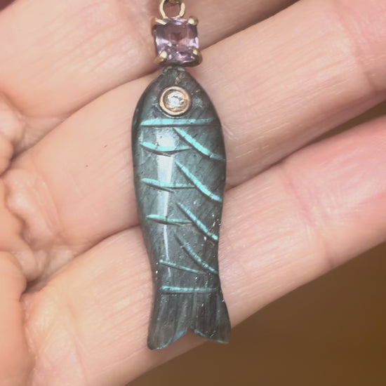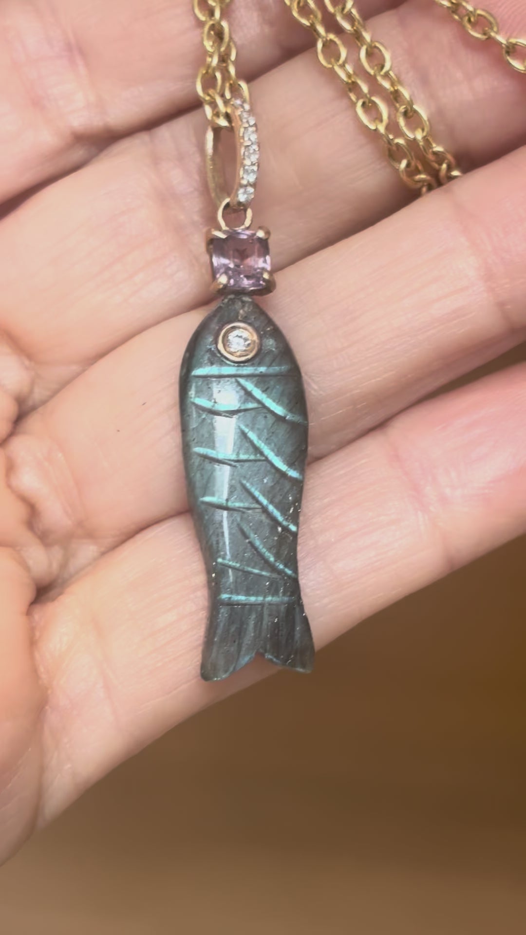Carved Labradorite Fish, 1.5” in length excluding the diamond bail, with a 2mm diamond eye bezeled in gold and a Pink Spinel connecting the diamond bail.