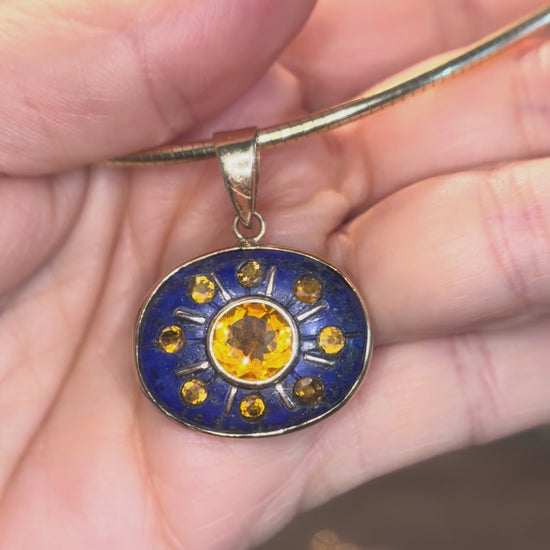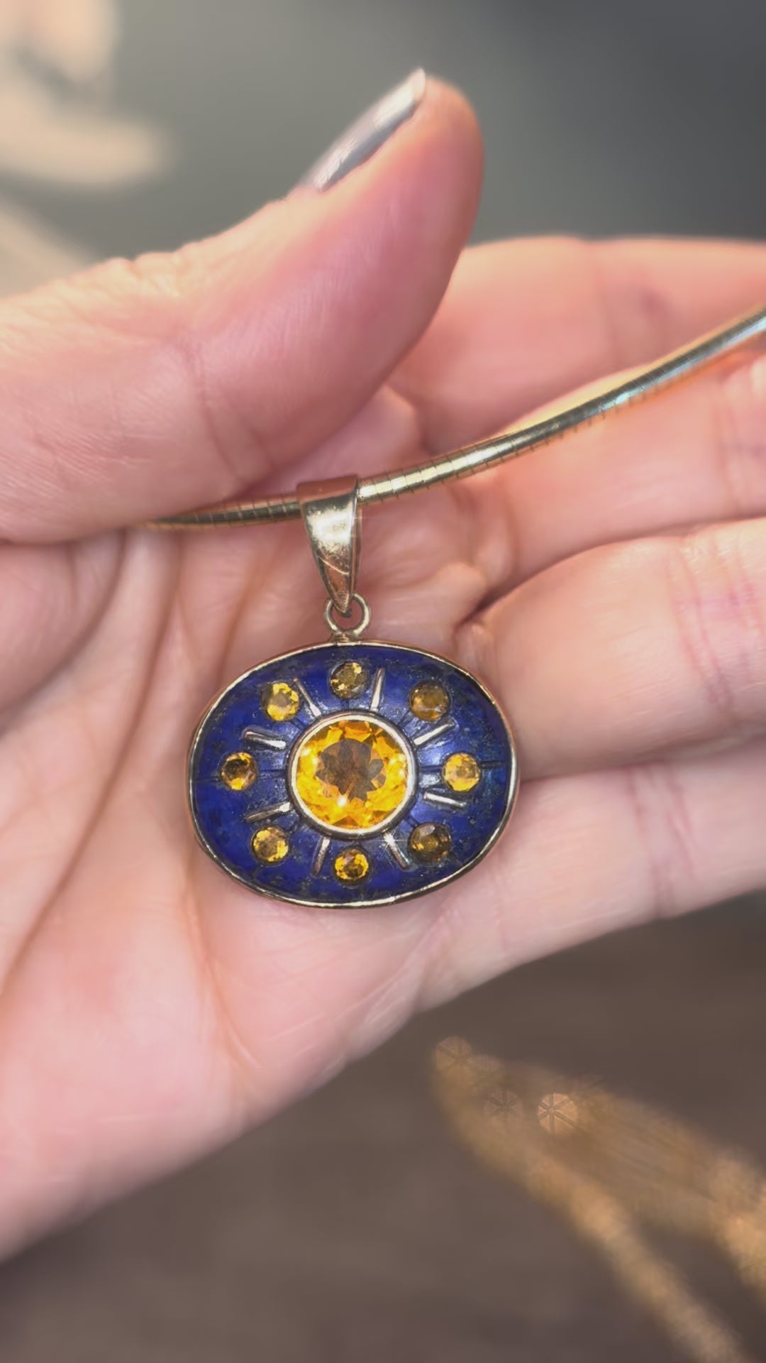 Carved Lapis sun with a center 9mm round citrine bezeled in 14k gold surrounded by eight 3mm round citrines and 14k Gold sun rays.