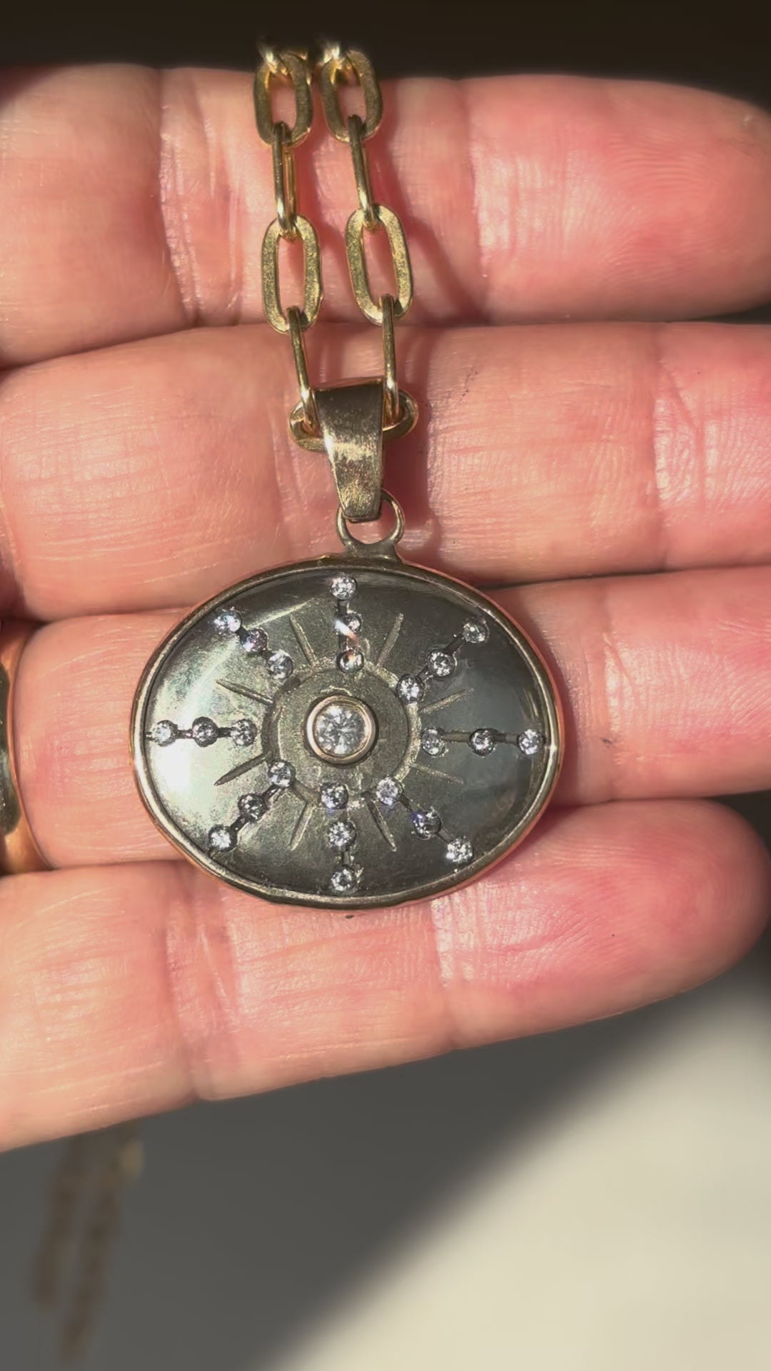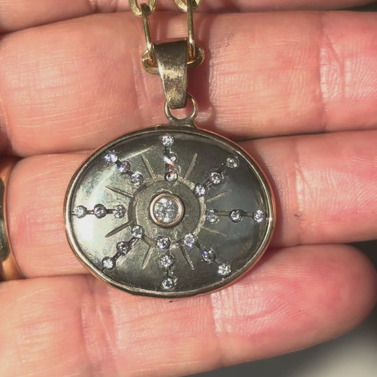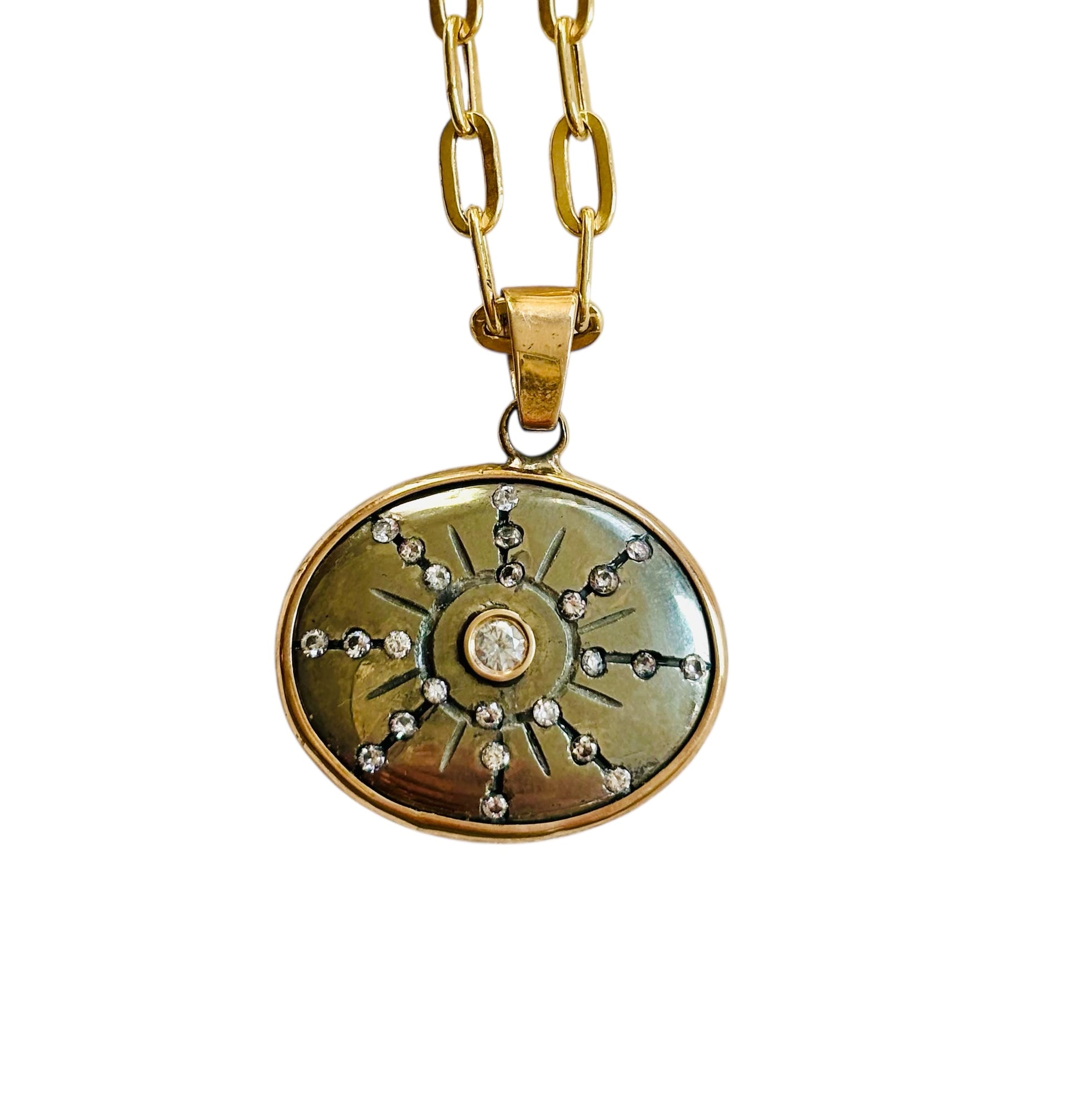 Carved pyrite with center 2.5mm diamond bezeled in 14k gold surrounded by twenty-four 1.5mm diamond sun rays.