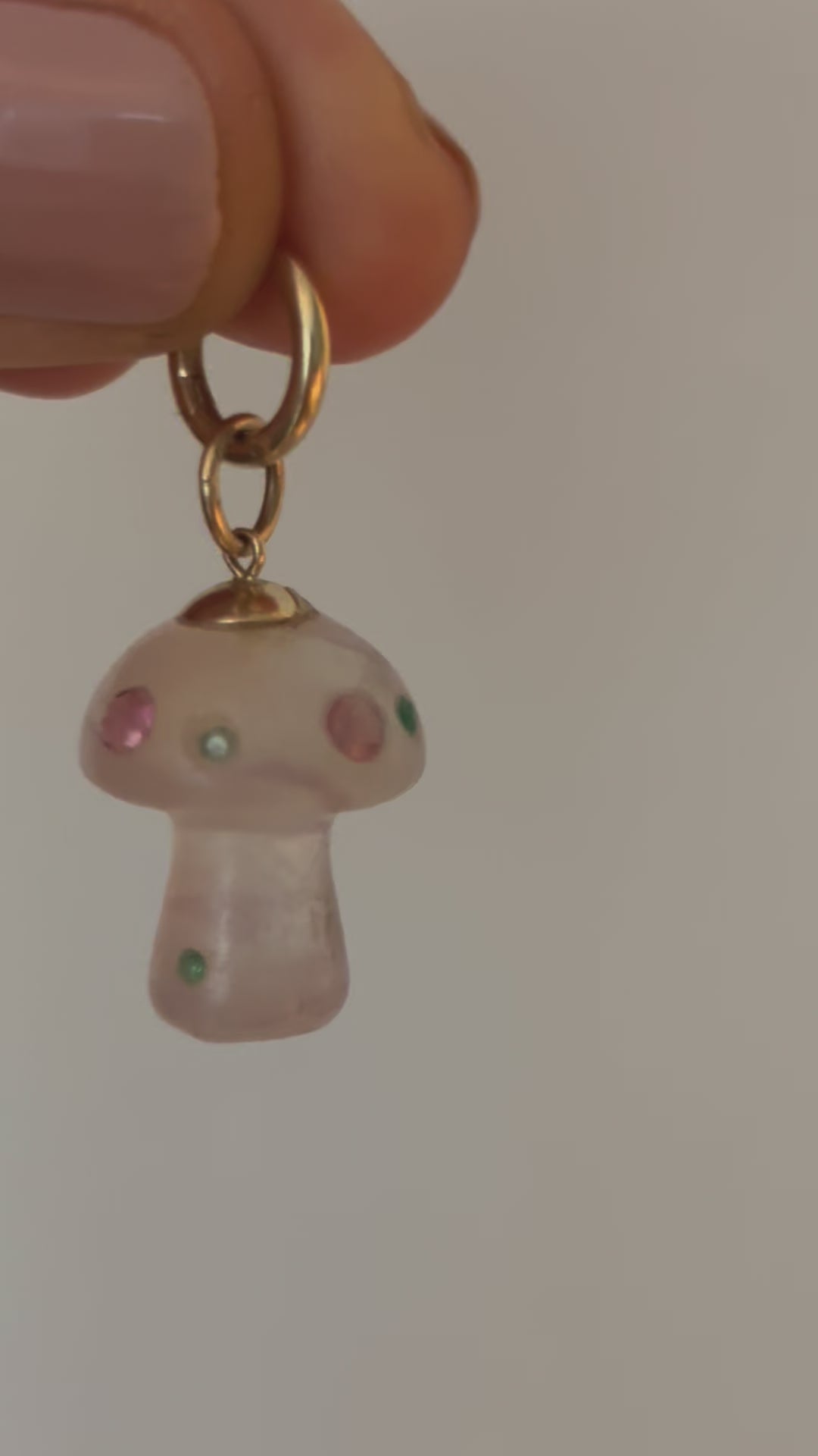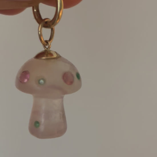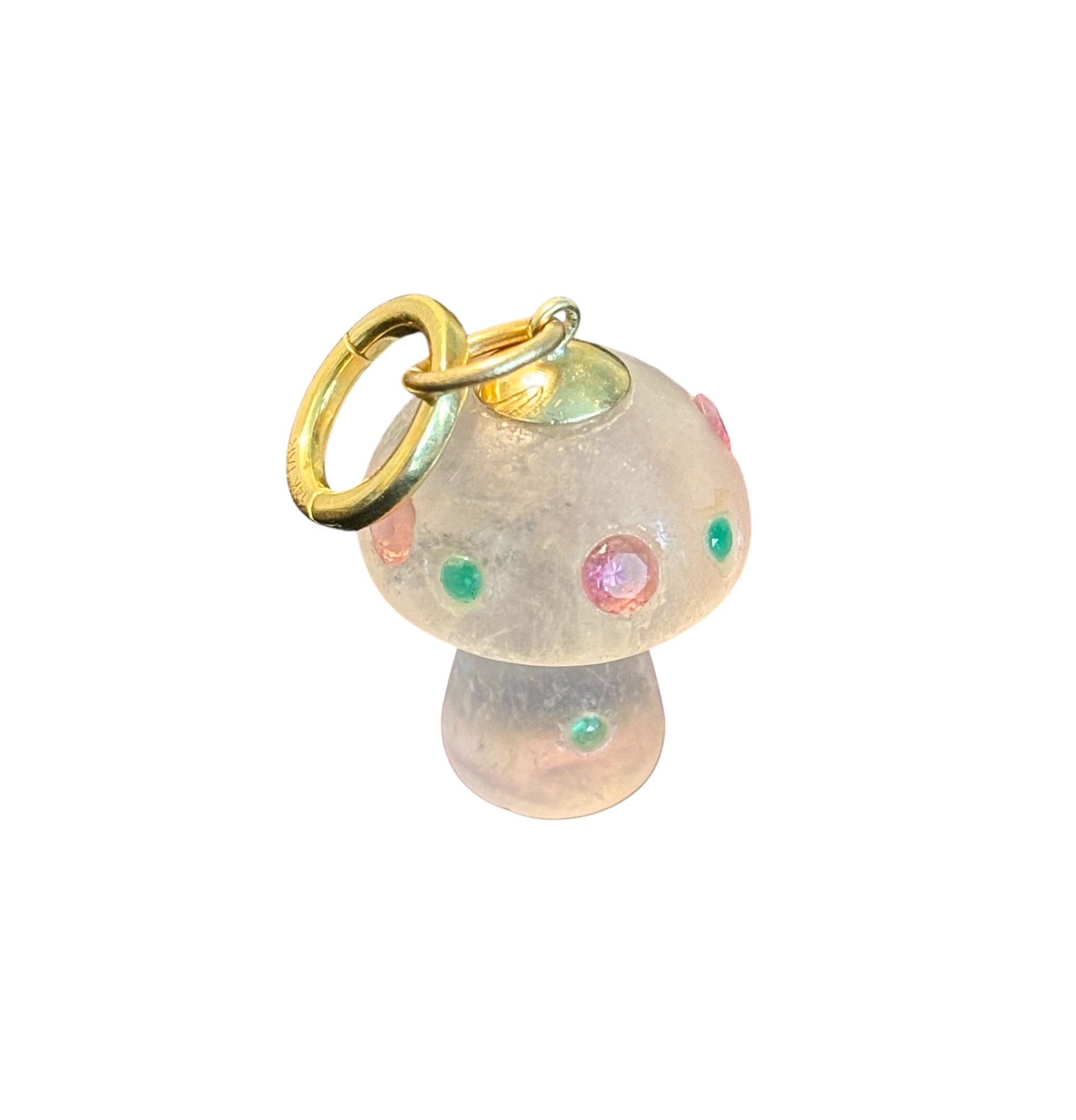 This magical fungi carved from beautiful fluorite has six 1.5mm round emeralds and and four 3mm round pink tourmalines.